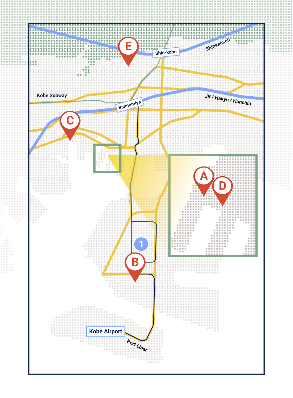 北の新幹線・新神戸駅と南の神戸空港を結ぶ地域でユニークベニューを提供する施設を展示物として、域内を周遊する滞在体験をプロデュースしています。