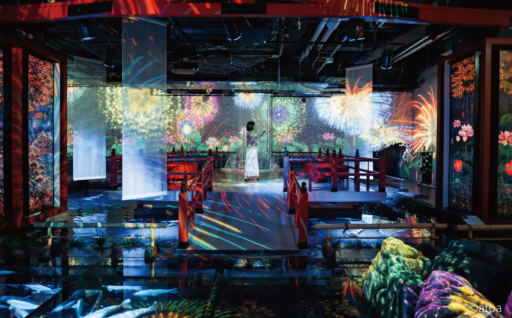 和の空間をイマーシブに演出するフロア『MIYABI』で淡路人形座による30分の伝統的な浄瑠璃(人形劇)を上演。鯉や金魚が泳ぐ空間と伝統芸能がコラボレートする特別企画です。